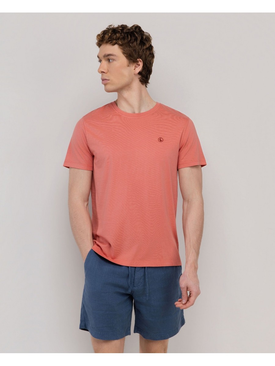 Camiseta de manga corta de la marca El Ganso. Con corte Regular Fit y cuello redondo. Patrón liso en color coral con logo distintivo de la marca bordado en el pecho. Elaborada mediante un proceso sostenible y responsable con el medio ambiente.