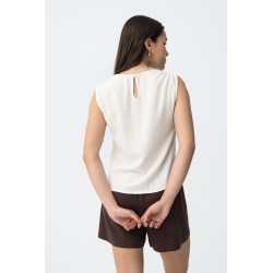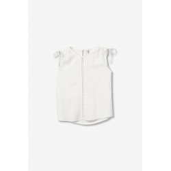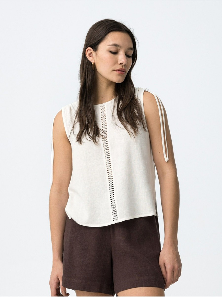 Top sin mangas de la marca Tiffosi. Con lazos en los hombros. Corte recto y cuello redondo. Costura central decorativa. Patrón liso en color blanco, con tejido en lino.