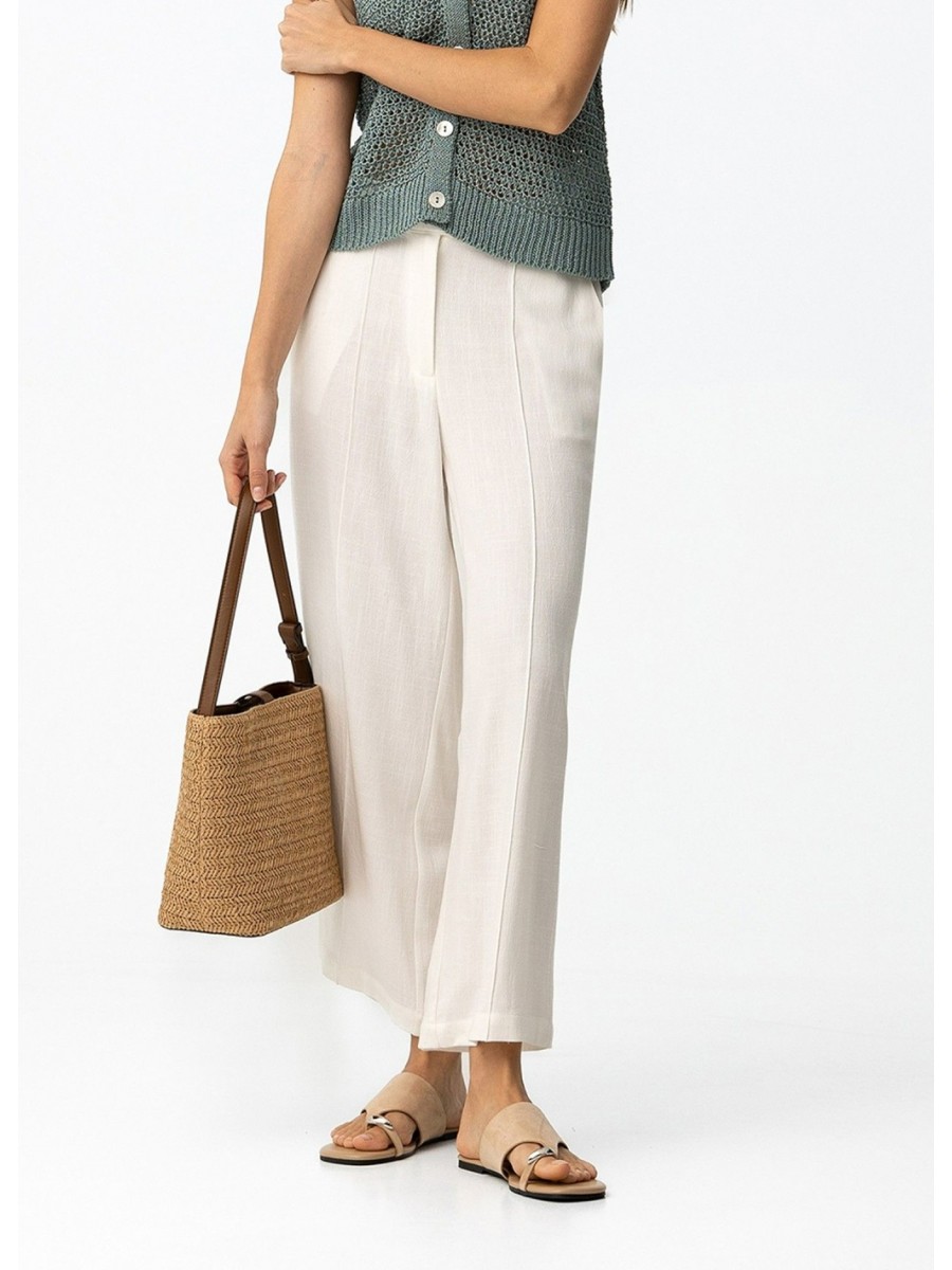 Pantalón de lino de la marca Tiffosi. Con corte ancho tipo culotte y cintura alta elástica. Cierre de botón y corchete. Bolsillos laterales visibles. Patrón liso en color blanco.