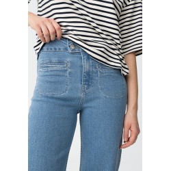 Pantalón vaquero de al marca Tiffosi. Modelo Olivia, con corte recto. Cierre de botones y cremallera. Con bolsillos traseros y delanteros, cuatro bolsillos. Patrón lavado en color azul claro.